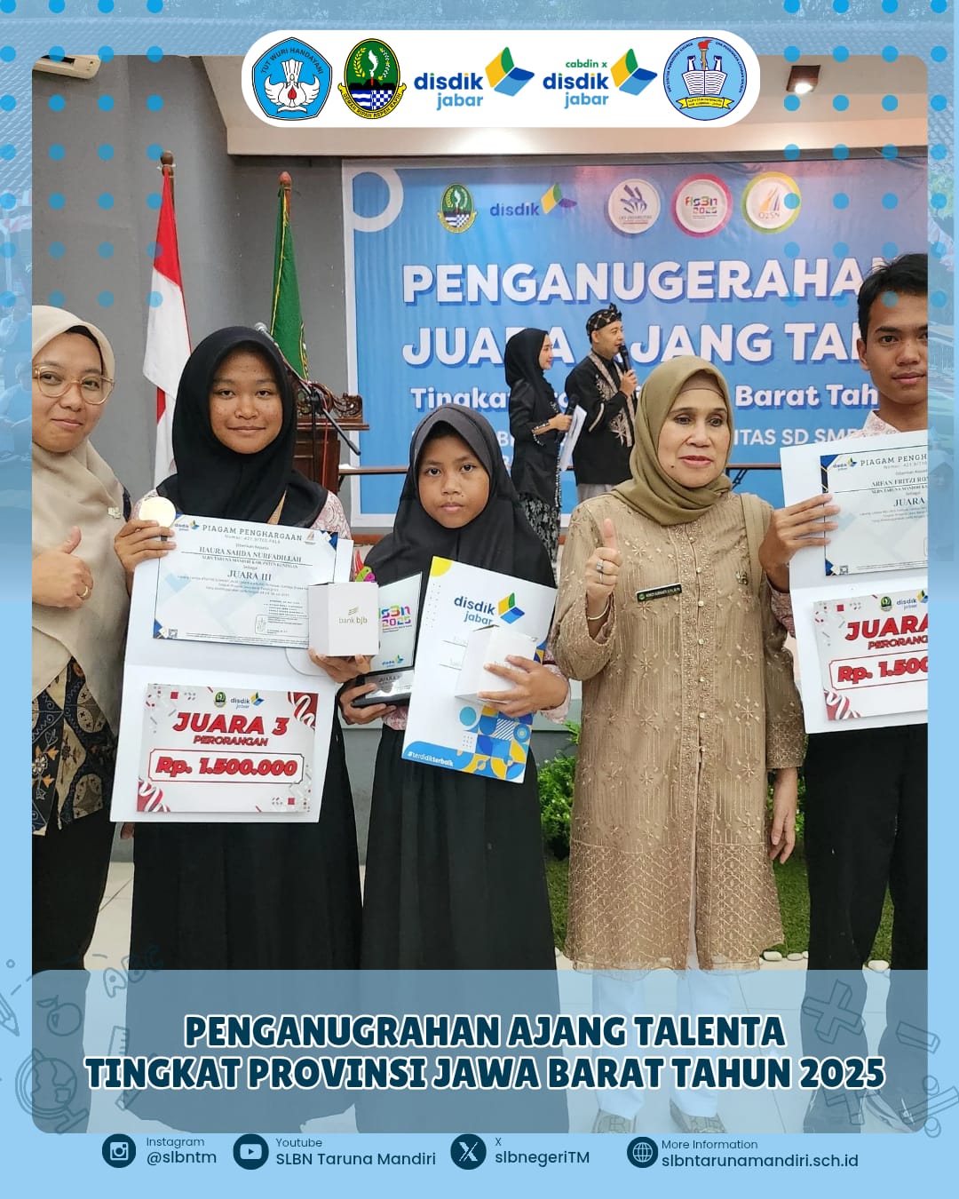 Selengkapnya: PENGANUGRAHAN AJANG TALENTA TINGKAT PROVINSI JAWA BARAT 2025Bandung (7/8/2025) Dinas Pendidikan Provinsi Jawa Barat menggelar Penganugerahan Juara Ajang Talenta Tingkat Provinsi Jawa Barat. Suatu kehormatan dan kebanggan bagi kami SLBN Taruna Mandiri, menjadi salah satu sekolah yang diundang dikegiatan tersebut. Alhamdulillah tiga peserta didik kami menerima Penganugerahan Juara Ajang Talenta @Arvan Pritzi Ronggoaji (Juara 3 Melukis SMPLB), @ Filzah Fayyadzah(Juara 3 Mewarnai)…